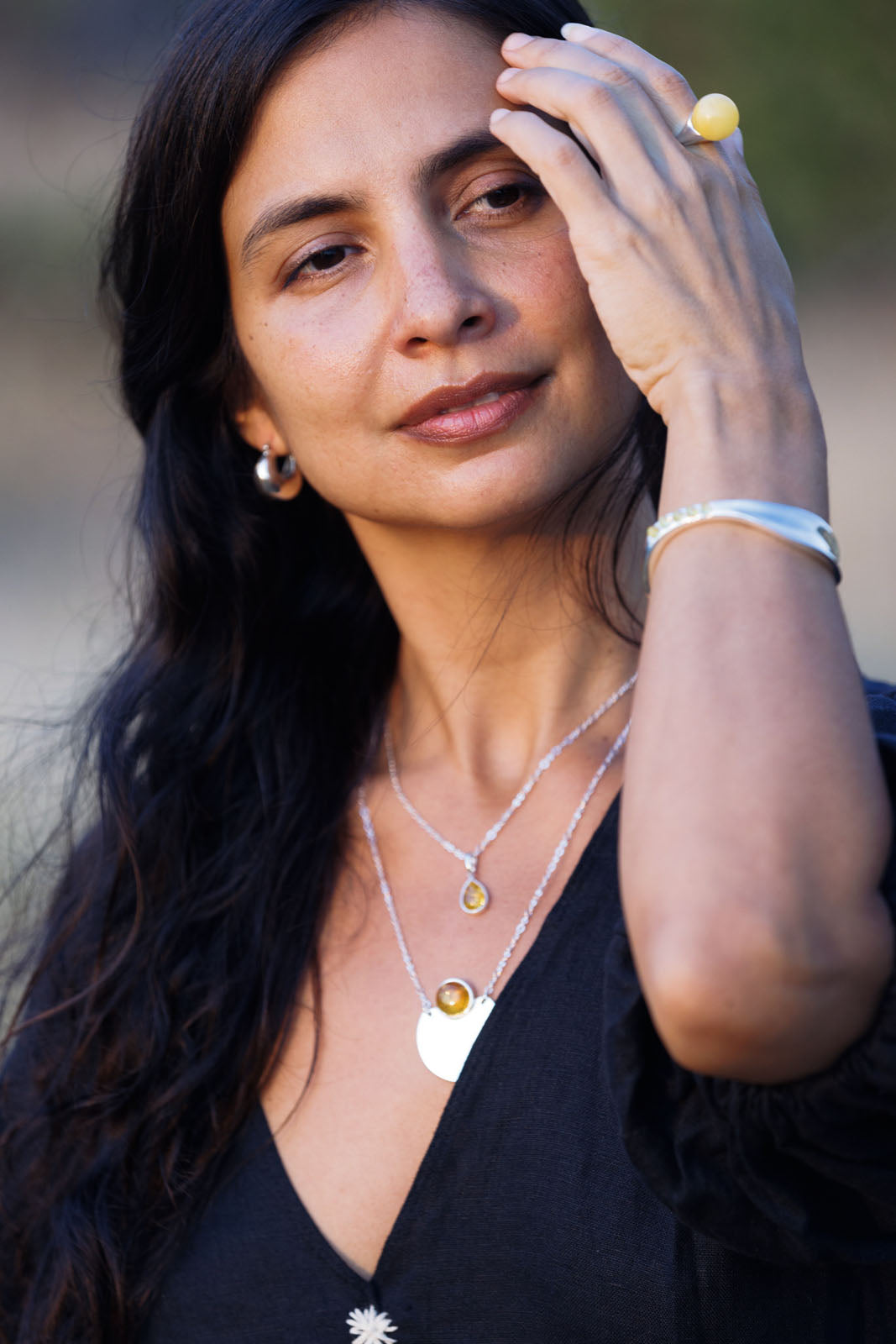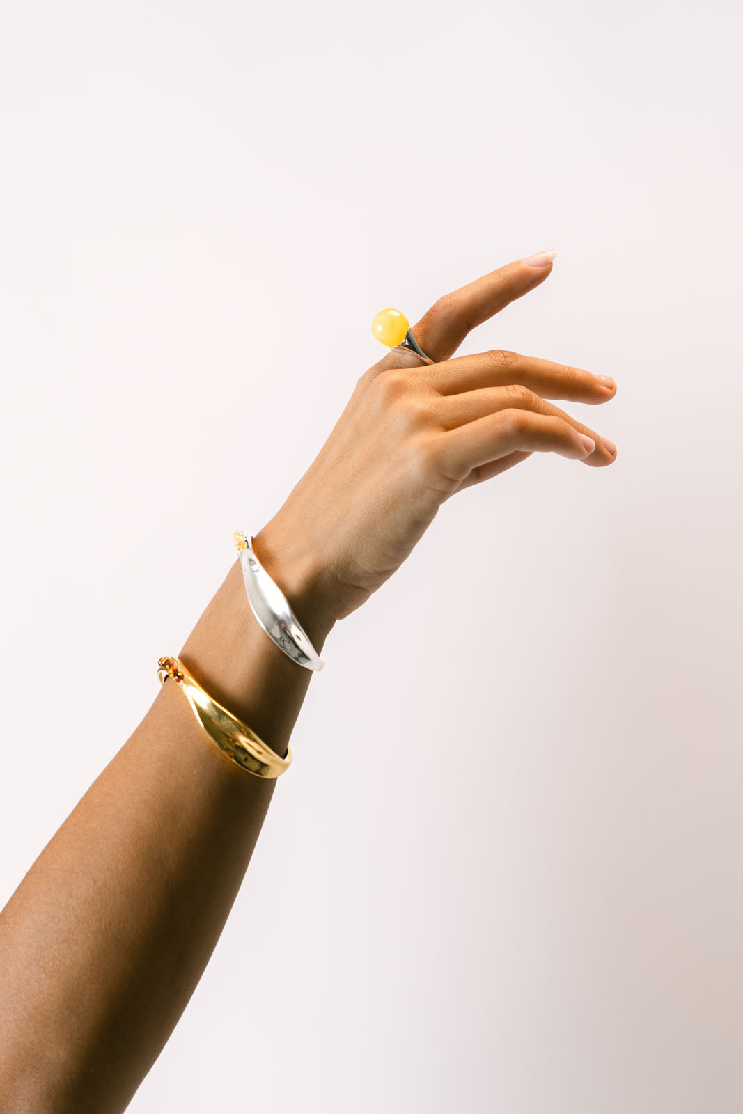 Indulge in the golden charm of the Chunky Honeyball Ring, featuring a radiant sphere of genuine Baltic amber. Set in 925 sterling silver, this sculptural piece is as irresistible as a drop of honey—bold, playful, and one-of-a-kind.